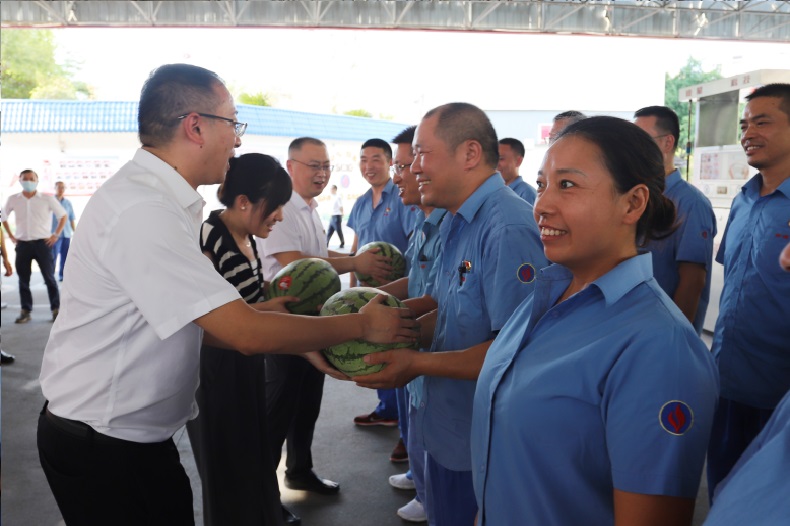 近段時(shí)間以來(lái),四川境內(nèi)氣溫持續(xù)攀升,很多時(shí)間達(dá)到40攝氏度以上。2022年8月18日,川投燃電黨委副書(shū)記、工會(huì)主席、職工董事包婷婷,黨委委員、紀(jì)委書(shū)記黃文東帶領(lǐng)相關(guān)負(fù)責(zé)同志到宏源公司開(kāi)展“送清涼”慰問(wèn)活動(dòng)。宏源公司黨委書(shū)記、董事長(zhǎng)、總經(jīng)理李旭東帶領(lǐng)經(jīng)營(yíng)班子成員參加活動(dòng)。